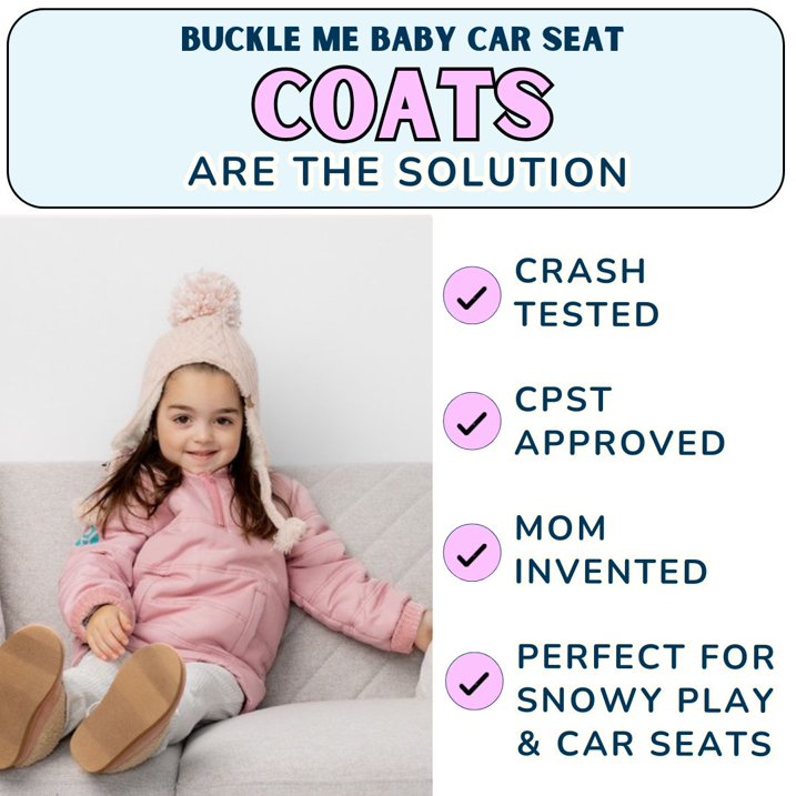 • WORRY FREE: The American Academy of Pediatrics recommends children should have their coat removed while in a car seat. But what if the car is freezing? What if your child doesn’t want their coat off and throws a fit? The solution? A Buckle Me Baby car seat coat that allows you to keep your child’s coat on – while at the same time keeping them safe.