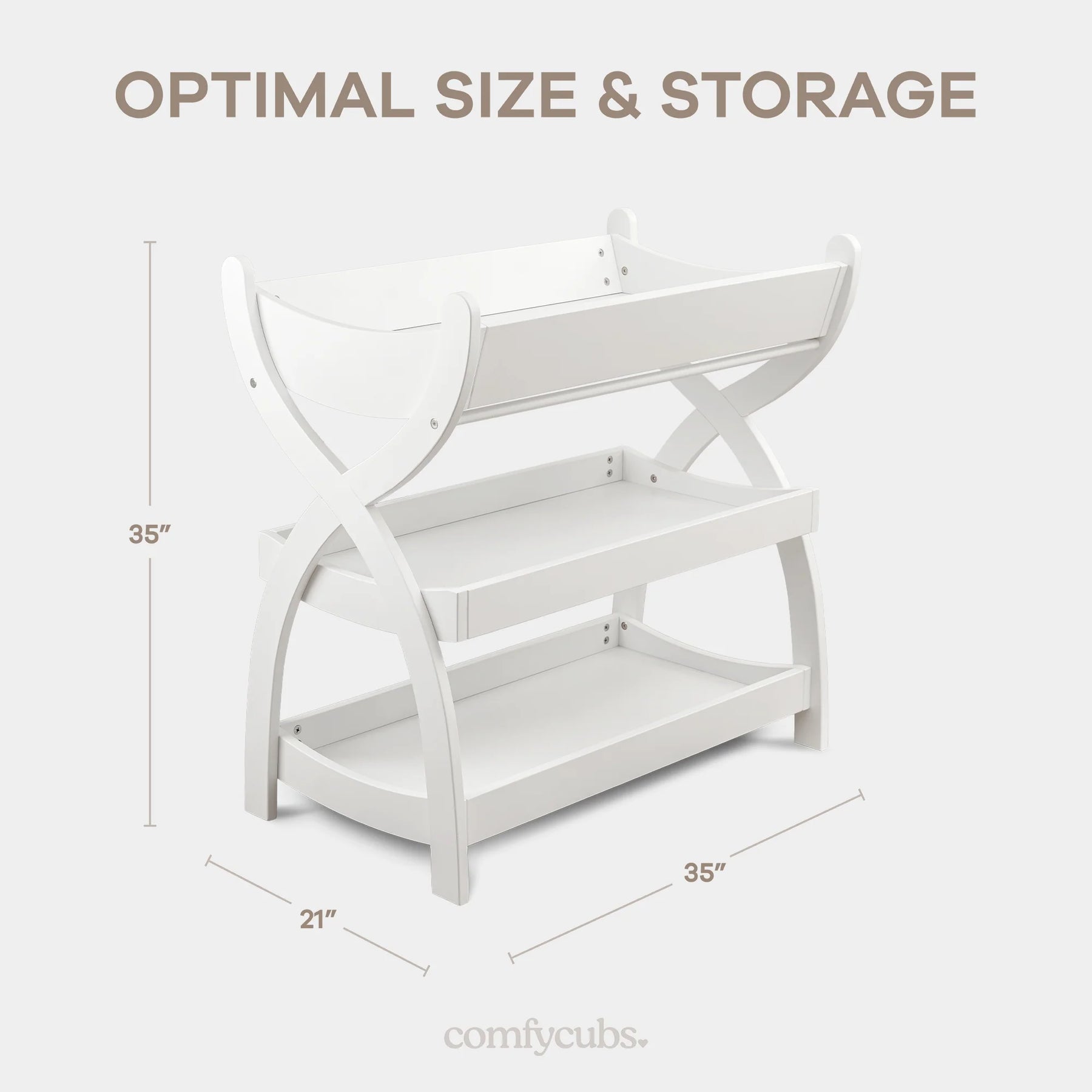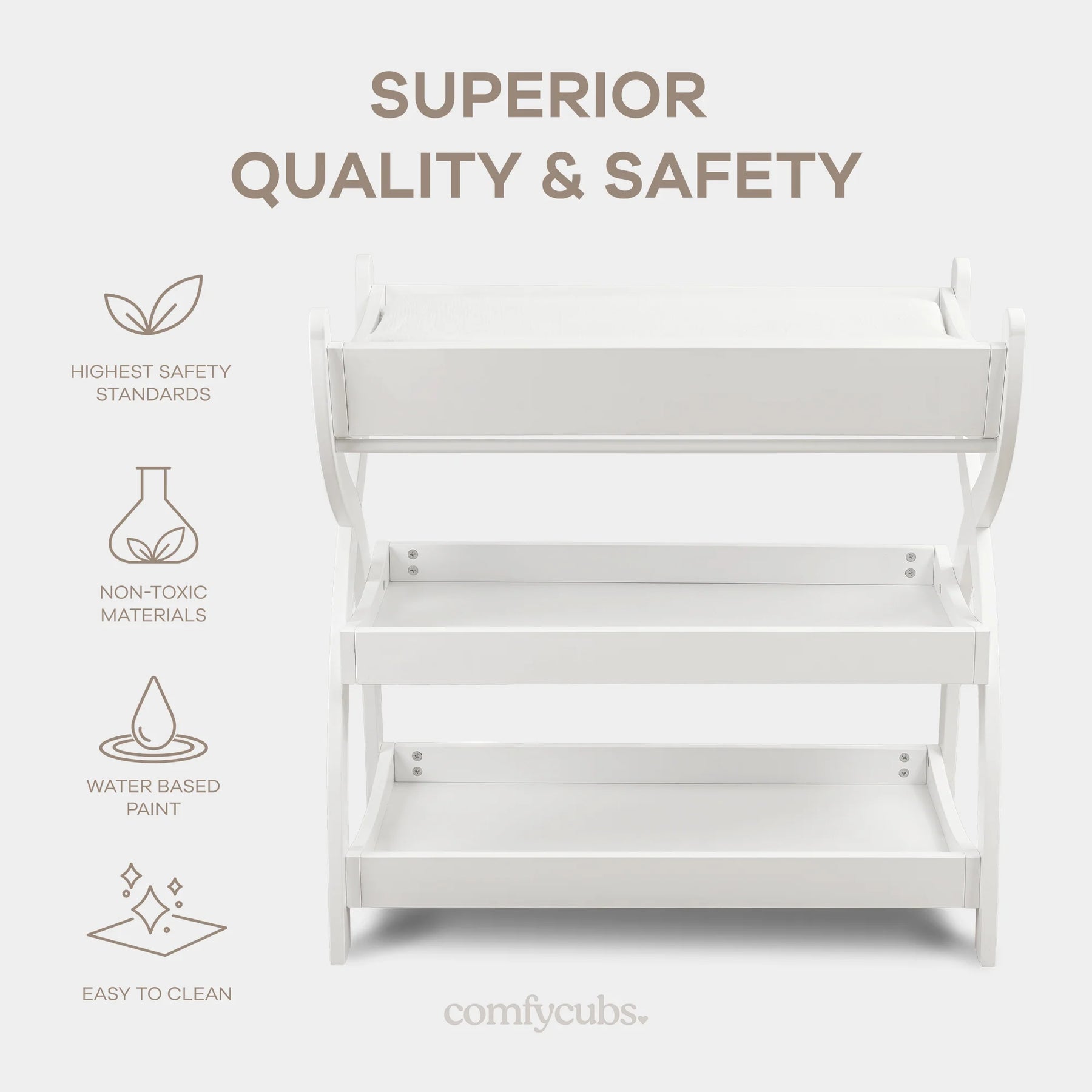 • Ample Storage with Two Open Shelves: Comfy Cubs diaper changing table features two spacious shelves to keep all your baby essentials within reach. It's great for nappies, wipes, clothes, and more, especially in small spaces.