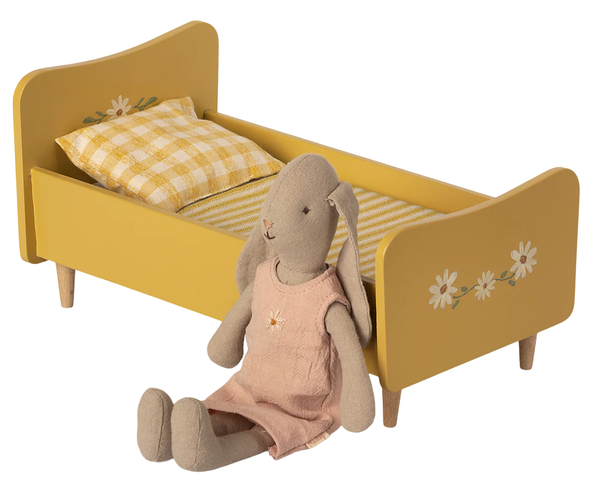 This hand-painted wooden bed will keep size 1 and 2 friends warm all night long. Complete with a matching pillow and cosy blanket, every rabbit or bunny will look forward to bed time after a long day of playing with friends.