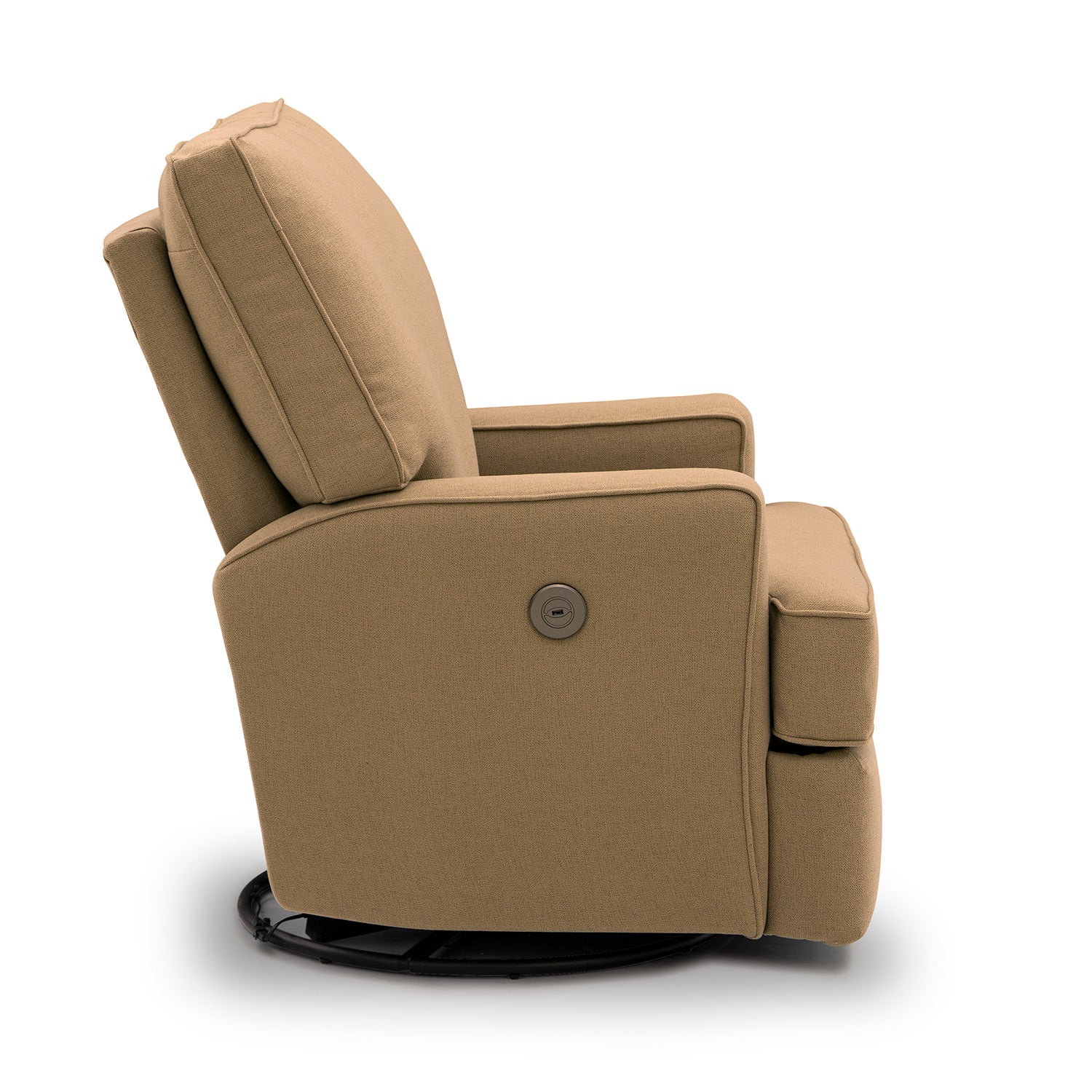 The Kersey swivel glider recliner is the ultimate in reclining comfort and versatility. Stylishly designed to appear as a club chair, the easy to use inside handle unveils the relaxing surprise. Deluxe your comfort and opt for the Power option that features a stylish push button with a USB charging port.