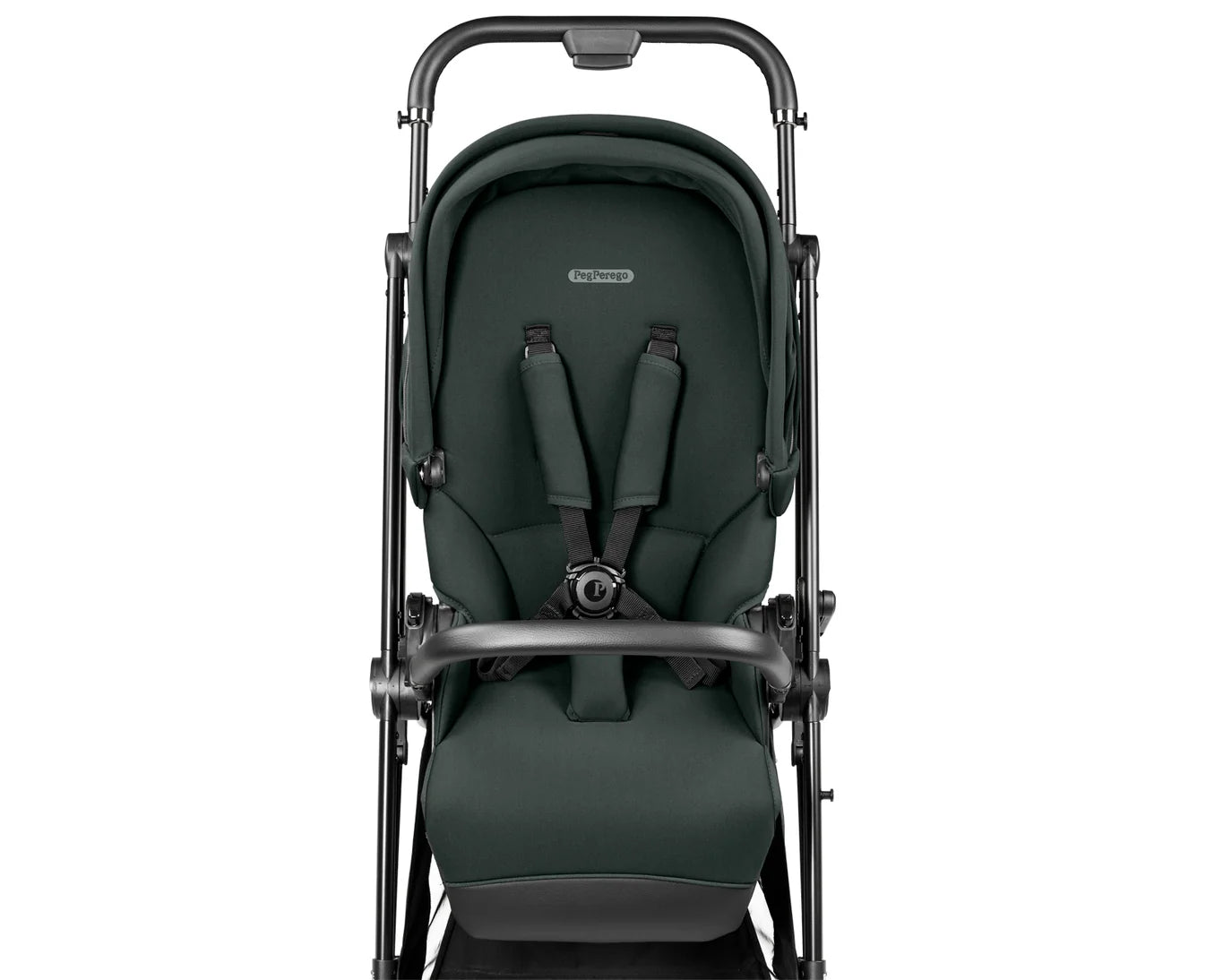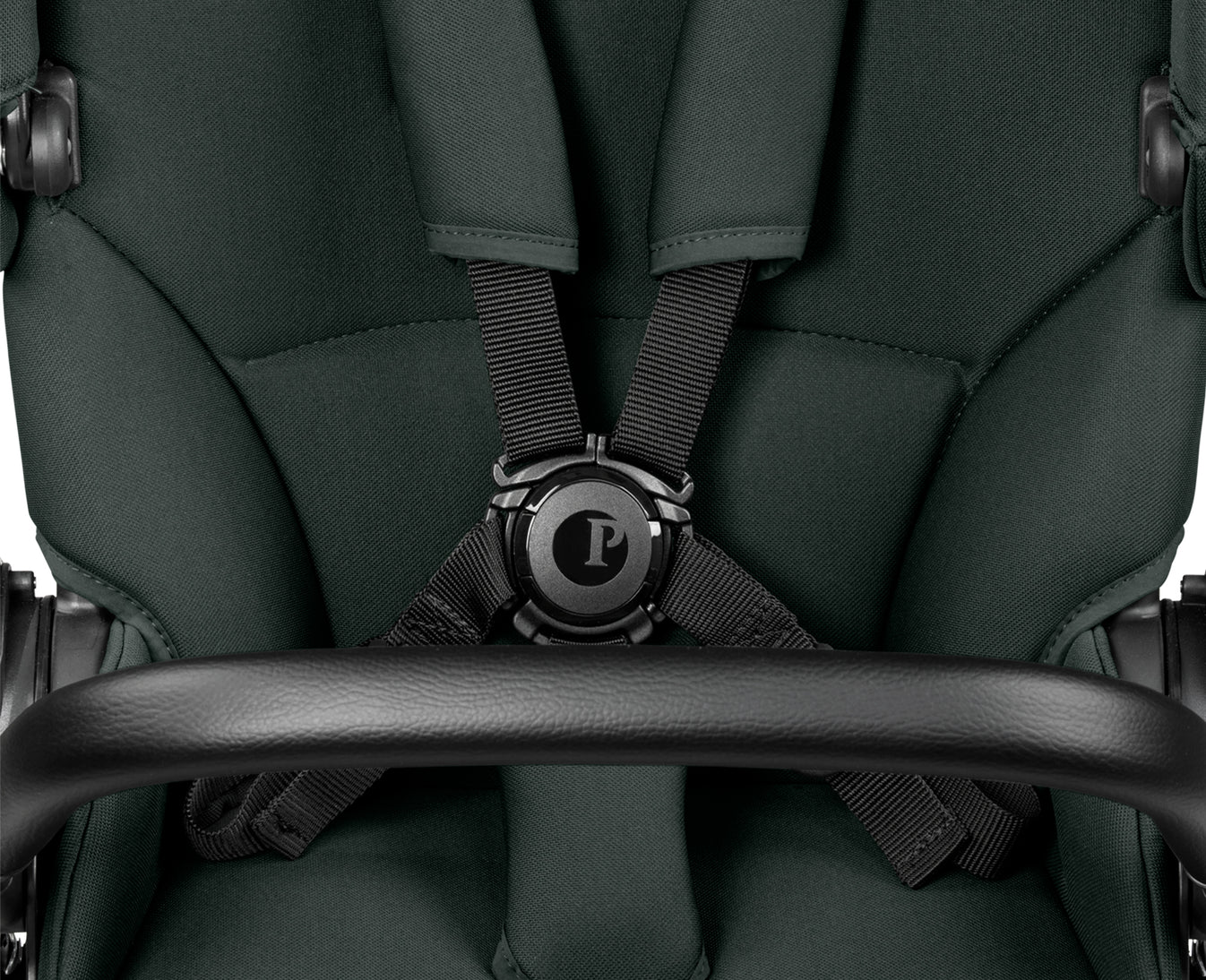 - Comfort and functionality are guaranteed by a roomy seat, a 5-point harness and an eco-leather front bar that opens and closes with ease.