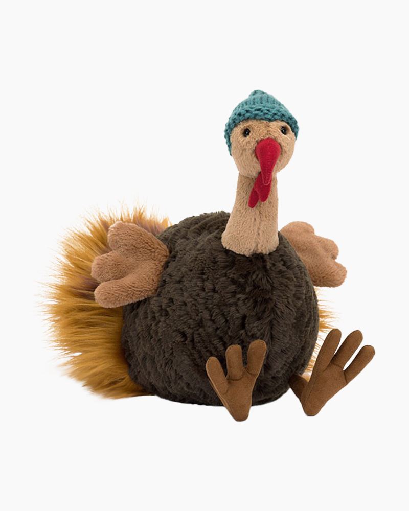 Theo Turkey may have plumage, but this turkey's taking no chances. He's knitted himself a bold teal hat, ready for the winter! Theo has over-sized honey feet, a round cocoa tummy and a silky ginger tail. Most impressive of all, this proud turkey has a beautiful suedette caruncle (that's the wobbly bit under his beak). A dazzling gift for happy holidays.
